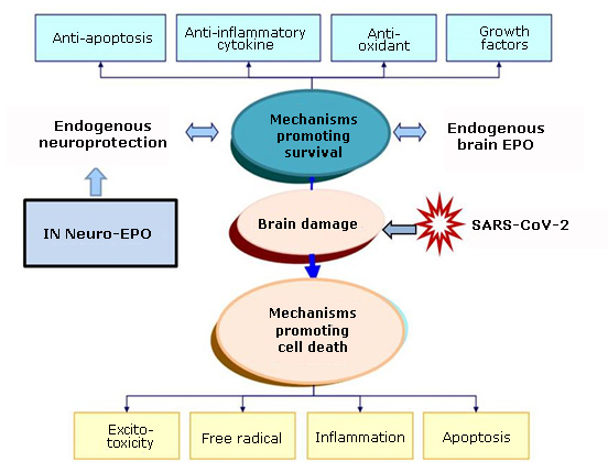 Fig. 1. Simplified schematic representation of the mechanisms through which intranasal (IN) Neuro-EPO modulates endogenous neuroprotection in SARS-CoV-2 infection. When its levels are affected in a cerebral region, by endogenous or exogenous xenobiotics, mechanisms that promote neuronal death are unleashed. When brain EPO levels are preserved, endogenous neuroprotective mechanisms prevail.